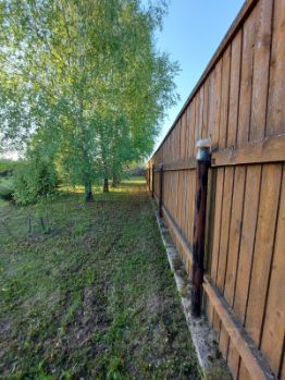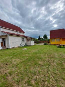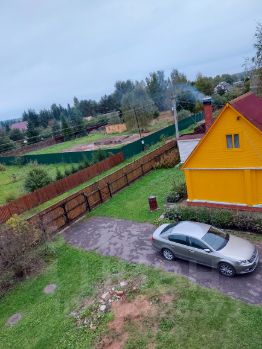 СНТ ''Протва'', Наро-Фоминский г.о., д. Золотьково. Участок 30 соток, правильной прямоугольной формы с круглогодичным подъездом. Участок покрыт газонной травой. На участке имеется асфальтовая площадка для парковки на 3 автомобиля. Участок огорожен деревянным 2-ух метровым забором из строганных крашенных досок на железных столбах на ленточном ж/б фундаменте. Дом 3 этажа, общей площадью помещений 177,3 кв.м, с жилой мансардой (37,2 кв.м),утепленной террасой из бруса (29,1 кв.м) и эркером. Дом на ленточном монолитном железобетонном фундаменте глубиной 1,5 метра, построен из бруса 150х150, проконопачен, обработан антисептиком Пинотекс с внутренней и наружной стороны, утеплен Роквул Скандик, сделана паро- и гидроизоляция наружных стен, после чего обшит канадским сайдингом. Установлены пластиковые окна и металлические двери. Зарегистрирован в Едином государственном реестре прав на недвижимое имущество. Дом имеет статус жилого. Сельский тариф на электроэнергию. В дом заведены электричество 15 кВт и питьевая вода из скважины. В доме имеется камин с чугунной топкой LAUDEL 800 (Франция), с вертикально поднимающейся стеклянной дверцей на контргрузах, с системой очистки стекла и шиберной заслонкой. Мощность камина 14 кВт, объем отапливаемого помещения до 350 куб.м. Крыша дома утеплена тремя слоями Роквул Скандик 50 мм внахлест, сделана паро- и гидроизоляция. В межкомнатных стенах использованы пожаробезопасные и звукоизоляционные материалы. Мансарда внутри утеплена и обшита вагонкой. Второй этаж отделан крашенной имитацией бруса класса А, потолки всех трех этажей обшиты крашенной вагонкой класса А. Первый этаж требует внутренней отделки, черновой пол по лагам уже уложен.Так же на участке построен добротный гостевой дом-баня из бревна сечением 24 см ( сруб 5м х 4 м - пятистенок с пристроенной террасой 5м х 2 м), дом-баня утеплен. Снаружи и изнутри, обшит вагонкой. Используется для круглогодичного проживания. В бане отличная рабочая кирпичная печь на дровах. В бане горячая (бойлер на 100 л) и холодная (из скважины через фильтр)вода, раковина и душ-кабина. Вода самотеком канализируется в септик. На 2-ом этаже комната отдыха и кладовая комната. Холодильник, телевизор, газовая плита с баллоном и редуктором, приемник спутникового телевидения с антенной и вся мебель ( две кровати,комод с зеркалом, тумбочки, кухонный стол, стулья) - все остается покупателю. Плюс годовой запас березовых колотых дров в подарок.На участке так же расположены:- Гараж для мототехники 5м х 4м из пеноблоков на фундаменте из монолитной железобетонной плиты залитой на глубину 40 см,- Утепленная бытовка (15 кв.м.) на ленточном фундаменте 6м х 2,5м из бруса 100х100 с металлической дверью, пластиковым окном и утепленными полами. Стены из бруса и потолок внутри бытовки обшиты вагонкой. Наружные стены бытовки обшиты канадским сайдингом. В летний сезон бытовка используется для проживания,- Хоз.постройка (15 кв.м.) 6м х 2,5м для хранения инвентаря.