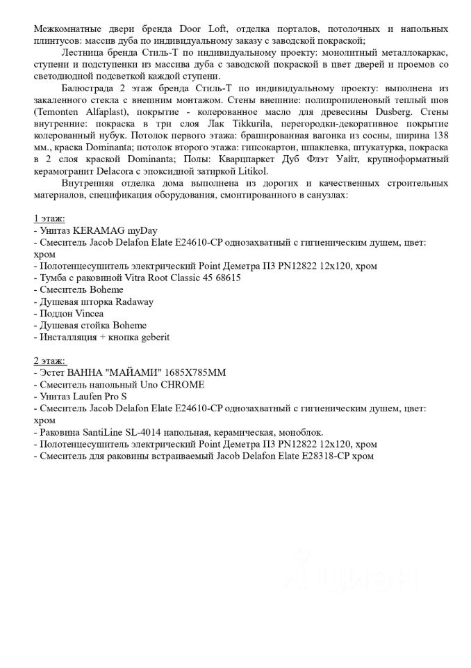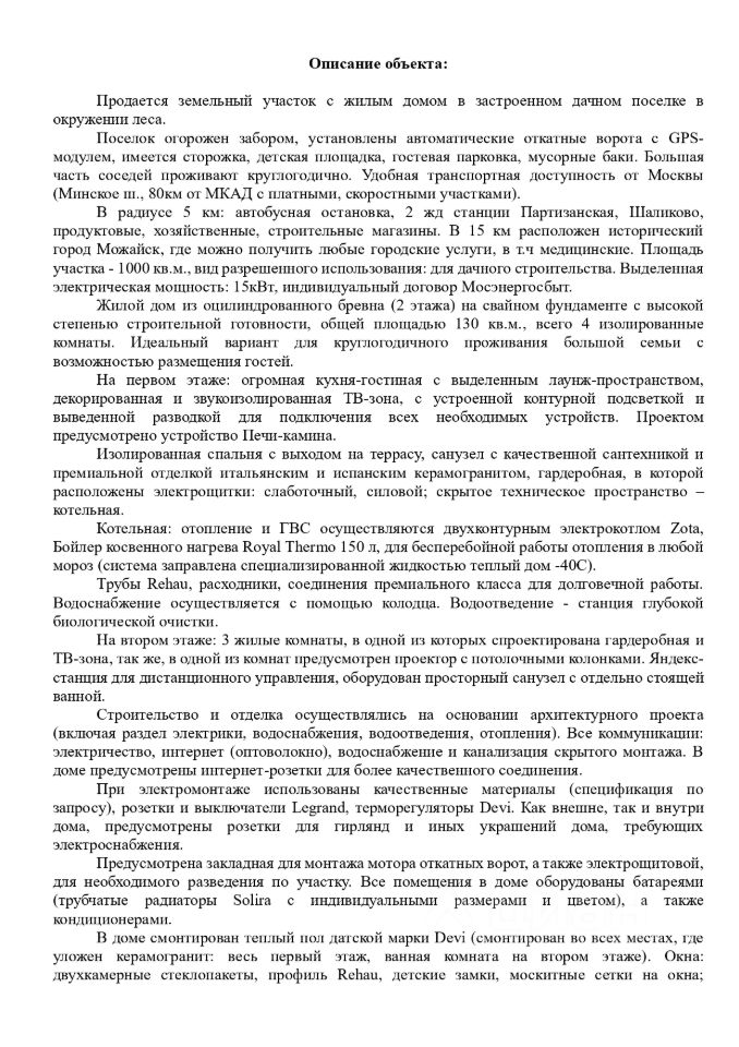 Продается земельный участок с двухэтажным жилым домом в застроенном дачном поселке в окружении леса. Поселок огорожен забором, установлены автоматические откатные ворота с GPS-модулем, имеется сторожка, детская площадка, гостевая парковка, мусорные баки. Удобная транспортная доступность от Москвы (Минское ш., 80км от МКАД с платными, скоростными участками). В радиусе 5 км: автобусная остановка, 2 ж/д станции Партизанская, Шаликово, продуктовые, хозяйственные, строительные магазины. В 15 км расположен г. Можайск, где можно получить любые городские услуги, в т.ч медицинские. Площадь участка - 1000 кв.м., вид разрешенного использования: для дачного строительства. Выделенная электрическая мощность: 15кВт, индивидуальный договор Мосэнергосбыт. Жилой дом из оцилиндрованного бревна на свайном фундаменте с высокой степенью строительной готовности, общей площадью 130 кв.м., всего 4 изолированные комнаты. Идеальный вариант для круглогодичного проживания большой семьи с возможностью размещения гостей. На первом этаже: огромная кухня-гостиная с выделенным лаунж-пространством, декорированная и звукоизолированная ТВ-зона, с устроенной контурной подсветкой и выведенной разводкой для подключения всех необходимых устройств. Проектом предусмотрено устройство печи-камина. Изолированная спальня с выходом на террасу, санузел с качественной сантехникой и премиальной отделкой итальянским и испанским керамогранитом, гардеробная, в которой расположены электрощитки: слаботочный, силовой, скрытое техническое пространство котельная. Отопление и ГВС осуществляются двухконтурным электрокотлом, бойлер косвенного нагрева 150 л, для бесперебойной работы отопления в любой мороз (система заправлена специализированной жидкостью теплый дом -40C). Трубы Rehau, расходники, соединения премиального класса для долговечной работы. Водоснабжение осуществляется с помощью колодца. Водоотведение - станция глубокой биологической очистки. На втором этаже: 3 жилые комнаты, в одной из которых спроектирована гардеробная и ТВ-зона, также в одной из комнат предусмотрен проектор с потолочными колонками. Яндекс-станция для дистанционного управления, оборудован просторный санузел с отдельно стоящей ванной. Строительство и отделка осуществлялись на основании архитектурного проекта (включая раздел электрики, водоснабжения, водоотведения, отопления). Все коммуникации: электричество, интернет (оптоволокно), водоснабжение и канализация скрытого монтажа. Внутренняя отделка дома выполнена из дорогих и качественных строительных материалов. Также в доме: теплый пол, двухкамерные стеклопакеты, детские замки, москитные сетки на окнах, трубчатые радиаторы, кондиционеры, межкомнатные двери, отделка порталов, потолочных и напольных плинтусов изготовлены из массива дуба по индивидуальному заказу c заводской покраской, лестница бренда Стиль-Т по индивидуальному проекту). Более подробное описание приведено в прикрепленном файле, по запросу готовы предоставить детальную спецификацию по материалам и оборудованию.