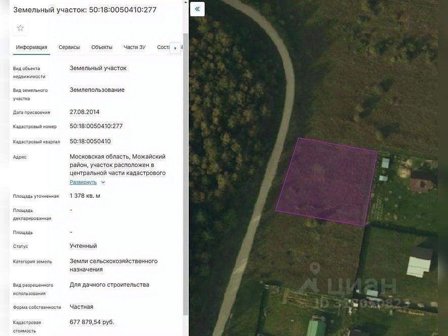 Кадастровый номер 50: 18: 0050410: 277Площадь участка 1378 +/ - 13 кв. мКатегория земель Земли сельскохозяйственного назначенияВид разрешенного использования Для дачного строительства