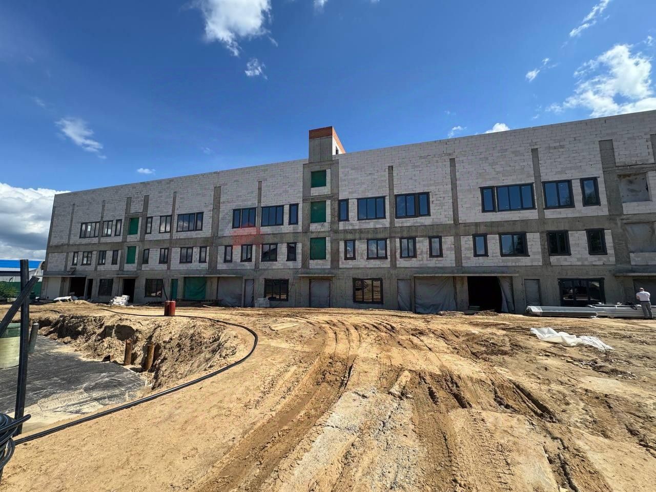 Коммуникации: выполнены ТУ на 450 кв.т. из них 250 кВт кабель заведен в здание 1 очереди., обустроена и лицензирована артезианская скважина с дебитом 2,4 куб.м/час, наружная сеть ХВС от скважины заведена в здание 1 очереди. Смонтированы две емкости для сбора стоков, наружные сети канализации выполнены на 50%. Выполнено обустройство геотермального теплообменника.