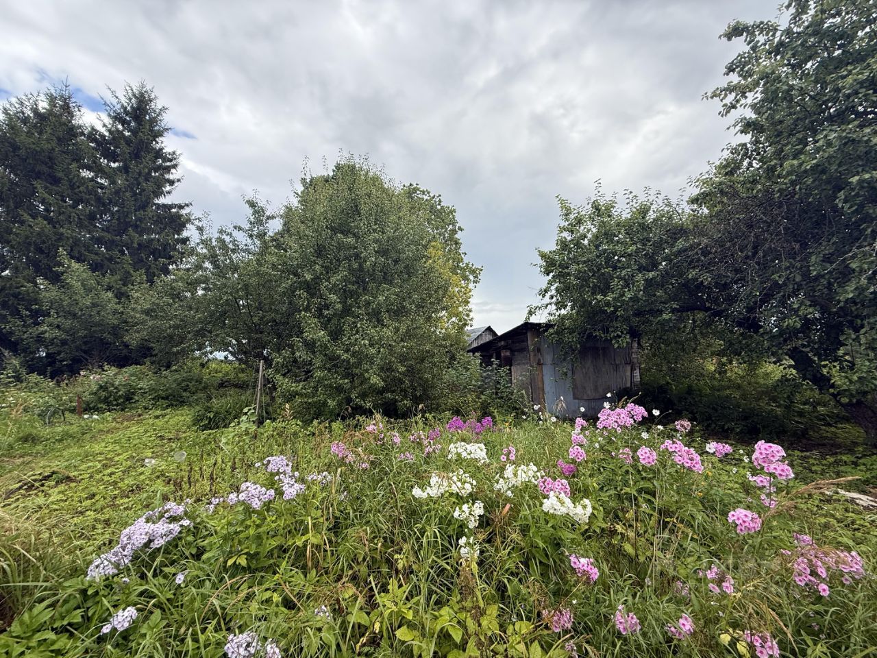 На участке растут яблони,груши,плодовые деревья,много цветов.