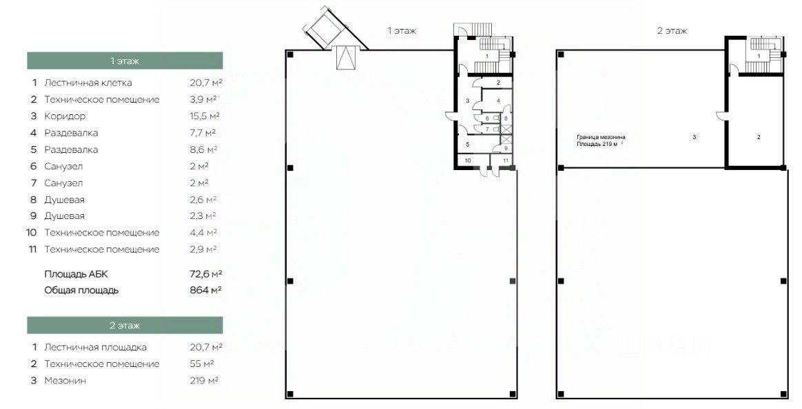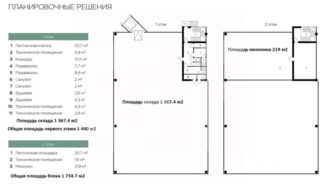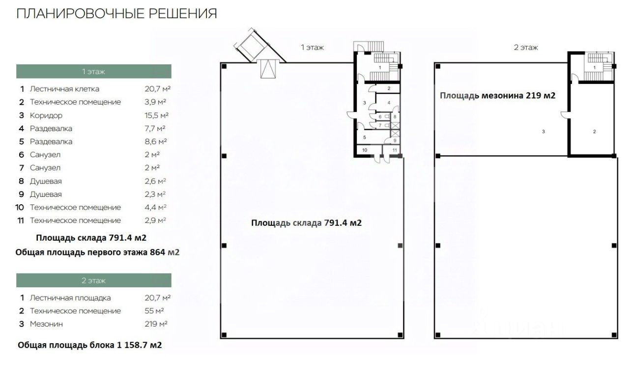 Общая площадь: 1 158.7 кв. м Склад: 791.4 кв. м Офис: 148.3 кв. м Мезонин: 219 кв. м